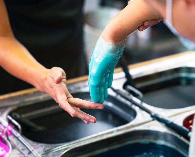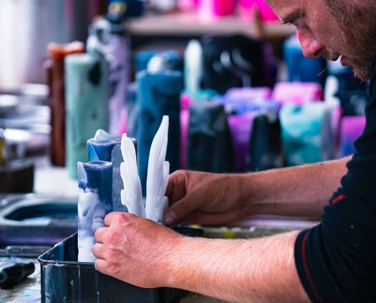 Living Candles offers an interactive activity, allowing your guests or audience to discover the art of candle-making and create their own wax objects. Capture a special moment by making wax hand moulds that we can transform into a sculpture, a lamp, or a real candle. Learn how to make dipped candles—timeless, decorative pieces that are fully customizable.